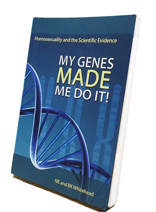 The book, My Genes Made Me Do It! Homosexuality and the Science was the outcome of a 20 year research project conducted by Dr Neil Whitehead, a man with a 40-year career in science and statistics and a PhD in biochemistry. It drew on research from all sides of the debate and showed - in the end - that homosexuality was not biologically imprinted, but was predominantly environmental (90%) and therefore greatly responsive to therapy and support. It showed that gays were not born gay and didn't have to stay gay if they didn't want to.
